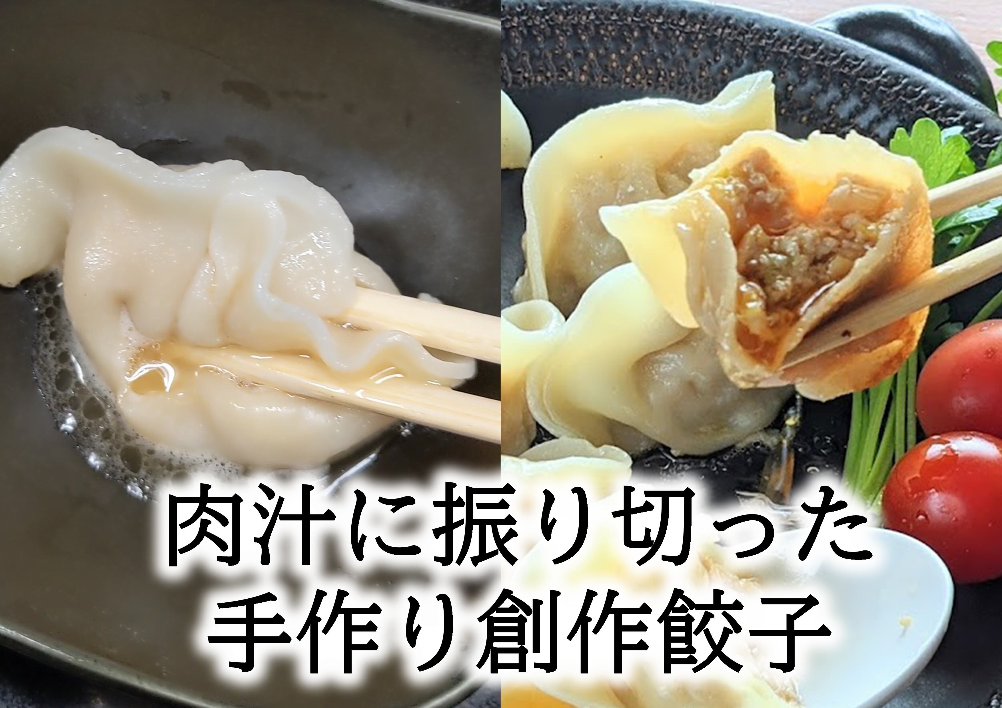 豊橋産の牛肉、豚肉、鶏肉(一部)で作った独創的な手作りの肉汁餃子です。