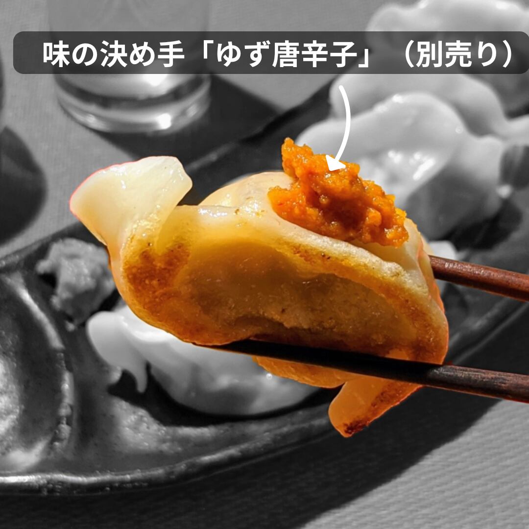 ニンニク未使用でモチモチの皮と肉汁の相性が抜群です。しっかりした味付けでそのままでも美味しくいただけます。備え付けのゆず唐辛子を付けると、また違った美味さが現れます。