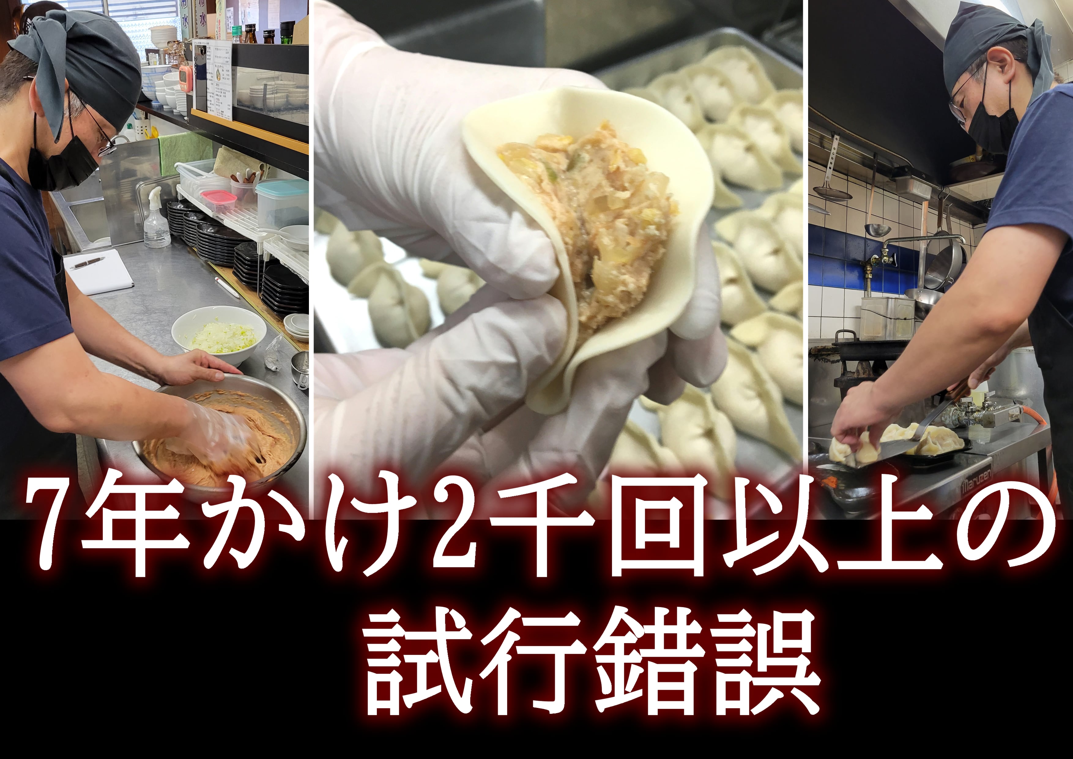 そして7年かけて2000回以上試行錯誤し、ついに肉と野菜の「黄金比率」を見つけました。更にその肉汁を包み込む為の、皮の厚さはどれくらいがベストなのか?質感は?形はどんな形にしたら肉汁を協調できるのか?今でも日々微調整を繰り返して進化を続けています。
